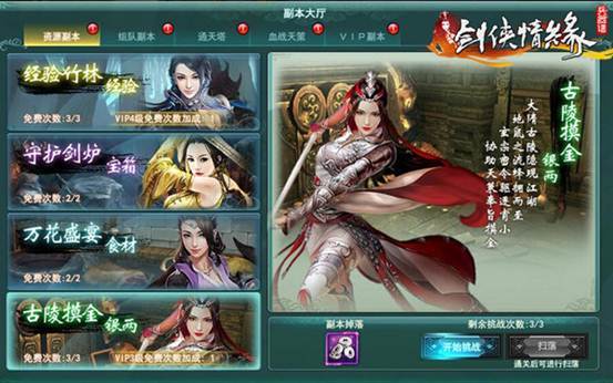在《剑侠情缘兵器谱》里,古陵摸金所属于单人通关的资源副本,通过攻击各种不同的守财怪,从而获得大量银两奖励。玩家满足35级以上每天有3次免费挑战的机会,如果全部次数使用完毕,还可以花费一定的元宝购买额外次数进行挑战。