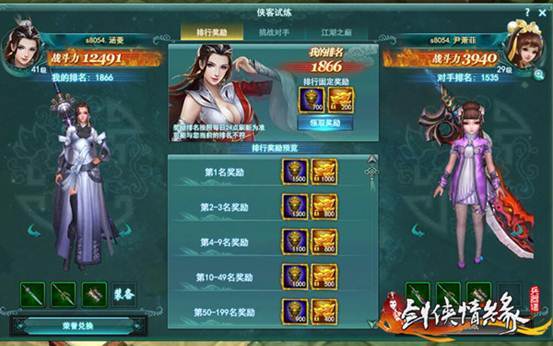 说了那么多竞技方面的内容,肯定有很多小伙伴按捺不住的问奖励在哪儿。在侠客试炼里,达到一定排名便可获得一定的荣誉和绑元奖励,消耗一定的荣誉点数可以在商城里兑换一些超级实用的道具,让角色的战力变得更强。