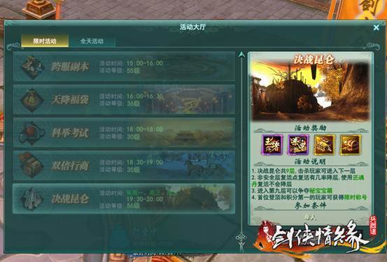 决战昆仑:决战昆仑共9层,击杀玩家可进入下一层,进入第九层的玩家可以争夺秘宝宝箱。如果玩家被杀,在非安全层复活点复活有几率降层,而使用还魂丹复活不会降层。在决战昆仑中首位登顶和积分第一的玩家可获得限时称号。