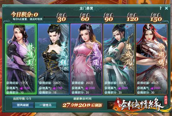龙门悬赏:角色每天可完成一定次数的龙门悬赏,悬赏任务短时间内会自动刷新,玩家也可以使用元宝立即刷新任务或刷新任务品质,完成任务后玩家可获得海量经验与真气奖励,同时还可获得积分,而当积分累积到一定数量后,还可额外领取丰厚的积分奖励。