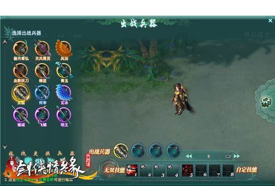 1.兵器谱:在兵器谱中可查看游戏中所有兵器,包括已获得的或未获得的兵器。同时,还可对已激活的兵器进行:升品、提升熟练度、升级技能、精炼等提高永久属性值。