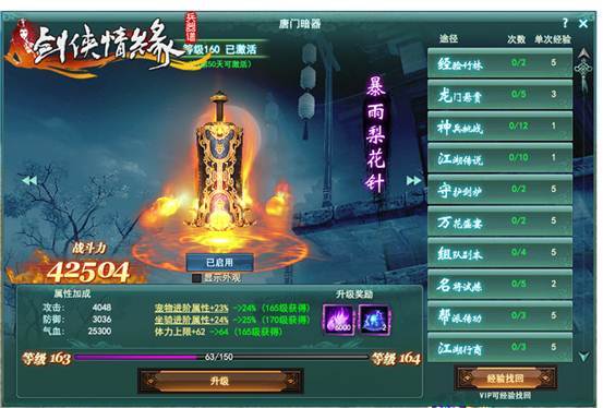 唐门暗器:完成一定的任务,副本,活动均可获得暗器经验,当暗器经验达到升级条件后,即可为暗器升级,暗器升级后可激活不同暗器外形,等级越高暗器的外形越酷炫,激活高等级暗器后还可获得丰厚奖励。