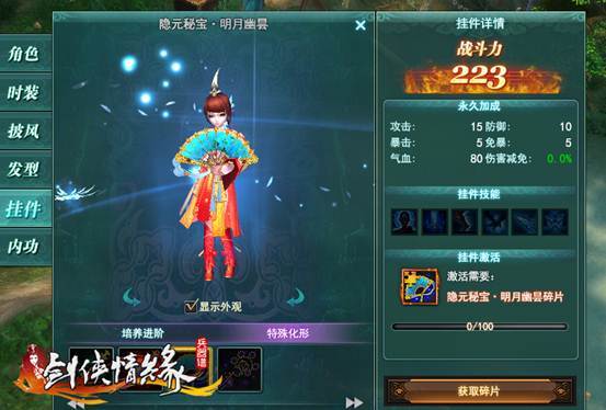 挂件:挂件开启后,通过进阶培养,升级挂件技能,穿戴挂件装备均可提升轻功战斗力与角色战斗力。
