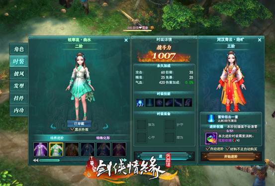 时装:时装开启后,通过进阶培养,升级时装技能,穿戴时装装备均可提升轻功战斗力与角色战斗力。